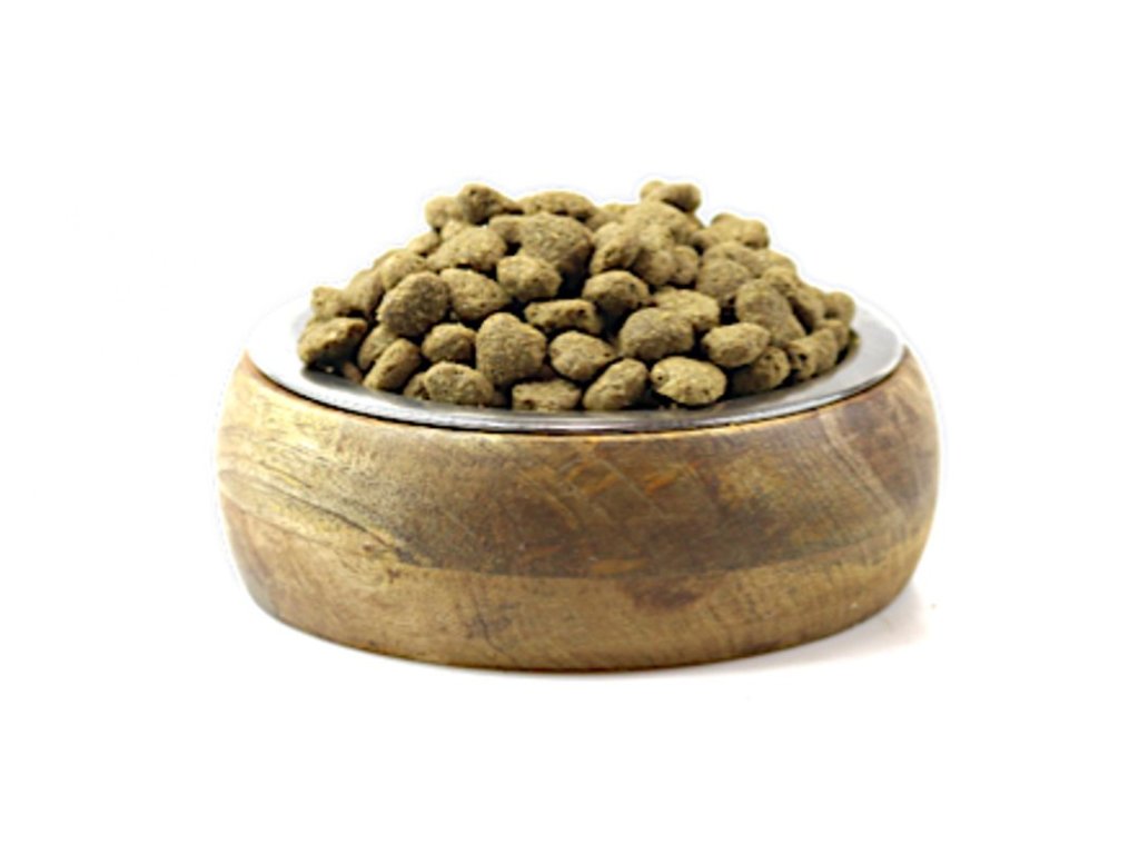 Sušená krůta, Rýže, Oves, Ječmen, Kuřecí tuk, Lněné semínko, Vojtěška, Minerály, Vitaminy, Sušená Mořská řasa.
