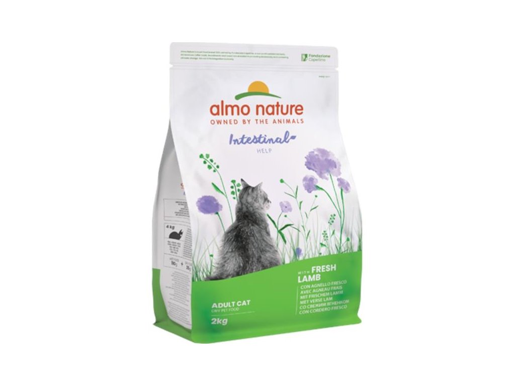 Almo Nature Intestinal Help je kompletní krmivo určené pro dospělé kočky s citlivým zažíváním. Jako hlavní složku obsahuje 26 % čerstvého jehněčího masa, které zajišťuje vysokou chutnost krmiva. Dále je obohaceno o omega-3 a omega-6 mastné kyseliny, minerály, vitamíny, taurin a prebiotika pro podporu střevní mikroflóry. Díky obsahu vybraných obilnin (především celozrnné rýže) obsahuje dietetickou vlákninu. Granule jsou konzervovány přírodně, neobsahují GMO, dochucovadla, barviva ani soli.