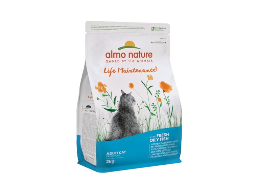 Almo Nature Life Maintenance je kompletní krmivo určené pro dospělé kočky. Jako hlavní složku obsahuje 26 % čerstvých tučných ryb (ančoviček), které zajišťují vysokou chutnost krmiva. Dále je obohaceno o omega-3 a omega-6 mastné kyseliny, minerály, vitamíny, taurin a prebiotika pro podporu střevní mikroflóry. Granule jsou konzervovány přírodně, neobsahují GMO, dochucovadla, barviva ani soli a nejsou testována na zvířatech.