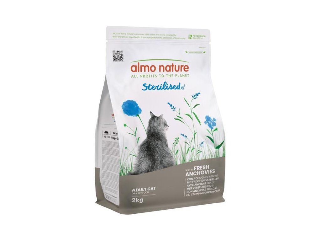 Almo Nature Sterilised je kompletní krmivo určené pro kastrované a méně aktivní dospělé kočky. Nízký obsah tuku a hořčíku spolu s dostatečným množstvím vlákniny činí z této receptury vhodnou volbu pro sterilizované kočky a kočky se sklonem k nadváze. Ideální je v kombinaci s kapsičkami Sterilised. Jako hlavní složku obsahuje 26 % čerstvých ryb (ančoviček), které zajišťují vysokou chutnost krmiva. Dále je krmivo obohaceno o omega-3 a omega-6 mastné kyseliny, minerály, vitamíny, taurin, L-karnitin a prebiotika pro podporu střevní mikroflóry. Granule jsou konzervovány přírodně, neobsahují GMO, dochucovadla, barviva ani soli.