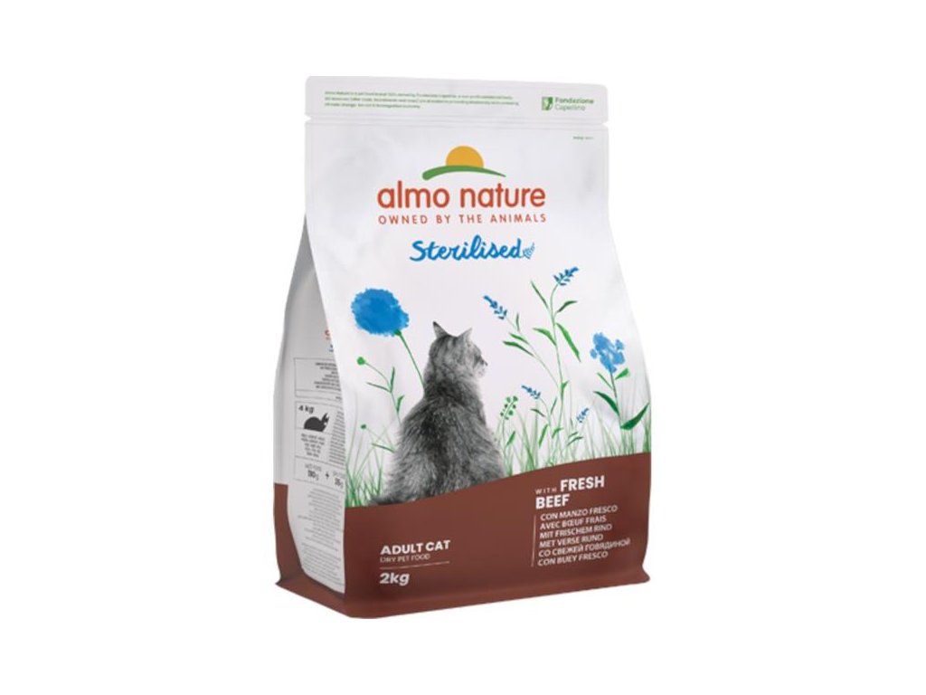 Almo Nature Sterilised je kompletní krmivo určené pro kastrované a méně aktivní dospělé kočky. Nízký obsah hořčíku spolu s dostatečným množstvím vlákniny činí z této receptury vhodnou volbu pro sterilizované kočky. Ideální je v kombinaci s kapsičkami Sterilised. Jako hlavní složku obsahuje 26 % čerstvého hovězího masa, které zajišťuje vysokou chutnost krmiva. Dále je krmivo obohaceno o omega-3 a omega-6 mastné kyseliny, minerály, vitamíny, taurin a prebiotika pro podporu střevní mikroflóry. Granule jsou konzervovány přírodně, neobsahují GMO, dochucovadla, barviva ani soli.