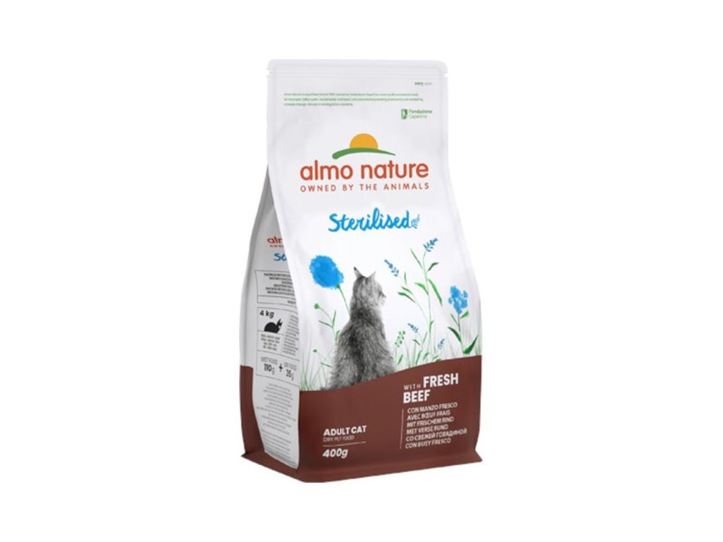 Almo Nature Sterilised je kompletní krmivo určené pro kastrované a méně aktivní dospělé kočky. Nízký obsah hořčíku spolu s dostatečným množstvím vlákniny činí z této receptury vhodnou volbu pro sterilizované kočky. Ideální je v kombinaci s kapsičkami Sterilised. Jako hlavní složku obsahuje 26 % čerstvého hovězího masa, které zajišťuje vysokou chutnost krmiva. Dále je krmivo obohaceno o omega-3 a omega-6 mastné kyseliny, minerály, vitamíny, taurin a prebiotika pro podporu střevní mikroflóry. Granule jsou konzervovány přírodně, neobsahují GMO, dochucovadla, barviva ani soli.