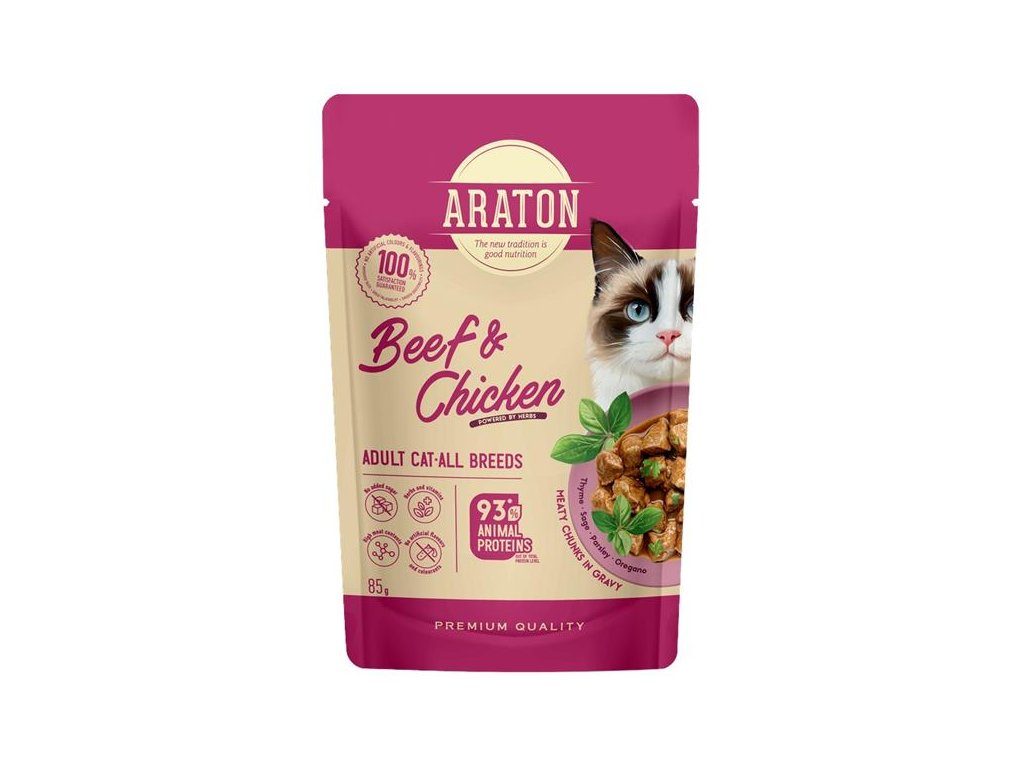 Kompletní vlhké krmivo Araton je navrženo pro dospělé kočky všech plemen pro každodenní krmení bez nadbytečných přísad, ale s prospěšným složením.