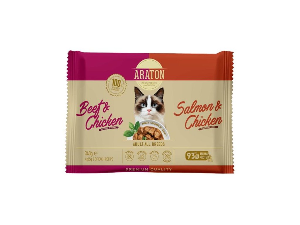 Kompletní vlhké krmivo Araton s prospěšným složením bez nadbytečných přísad je vhodné pro každodenní krmení dospělých koček všech plemen. Kapsičky obsahují kousky se 74–76 % složek živočišného původu ve šťavnaté omáčce, doplněné o byliny – vše vytvořeno s ohledem na přirozené instinkty koček a přání majitelů dopřát jim to nejlepší.