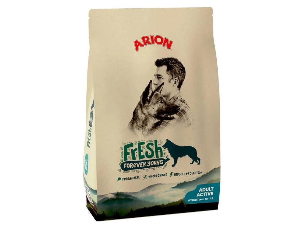 ARION Fresh - Adult Active je kompletní krmivo šité na míru vašemu aktivnímu čtyřnohému příteli. Toto krmivo obsahuje nezbytné živiny, aby podporovalo aktivní životní styl.Složení: Maso a vedlejší výrobky živočišného původu 36,22% (z toho 4 % čerstvé kuře, sušené vepřové maso, sušené kuřecí maso, chuťový zlepšovač), obiloviny 23,65% (z toho 14 % celozrnná pšenice, kukuřice, ječmen), vedlejší výrobky rostlinného původu (včetně kopřivy, hořce, měsíčku, heřmánku, fenyklu), oleje a tuky 12,9%