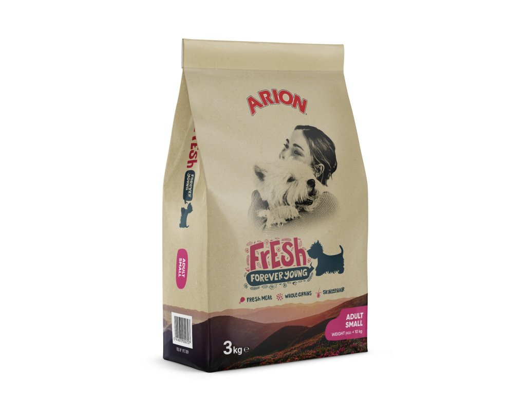 ARION Fresh - Adult Small Breed je kompletní krmivo šité na míru pro vašeho malého čtyřnohého přítele. Toto krmivo obsahuje nezbytné živiny, aby vašemu psovi nabídlo potřebnou vitalitu a zajistilo dlouhá společná léta spokojeného života.Složení: Maso a vedlejší výrobky živočišného původu 35,12% (z toho 4 % čerstvé kuře,sušené vepřové maso,sušené kuřecí maso, chuťový zlepšovač), obiloviny 26,95% (z toho 14 % celozrnná pšenice, kukuřice,ječmen), vedlejší výrobky rostlinného původu (včetně kopřivy, hořce, měsíčku, heřmánku, fenyklu), oleje a tuky 7,93%