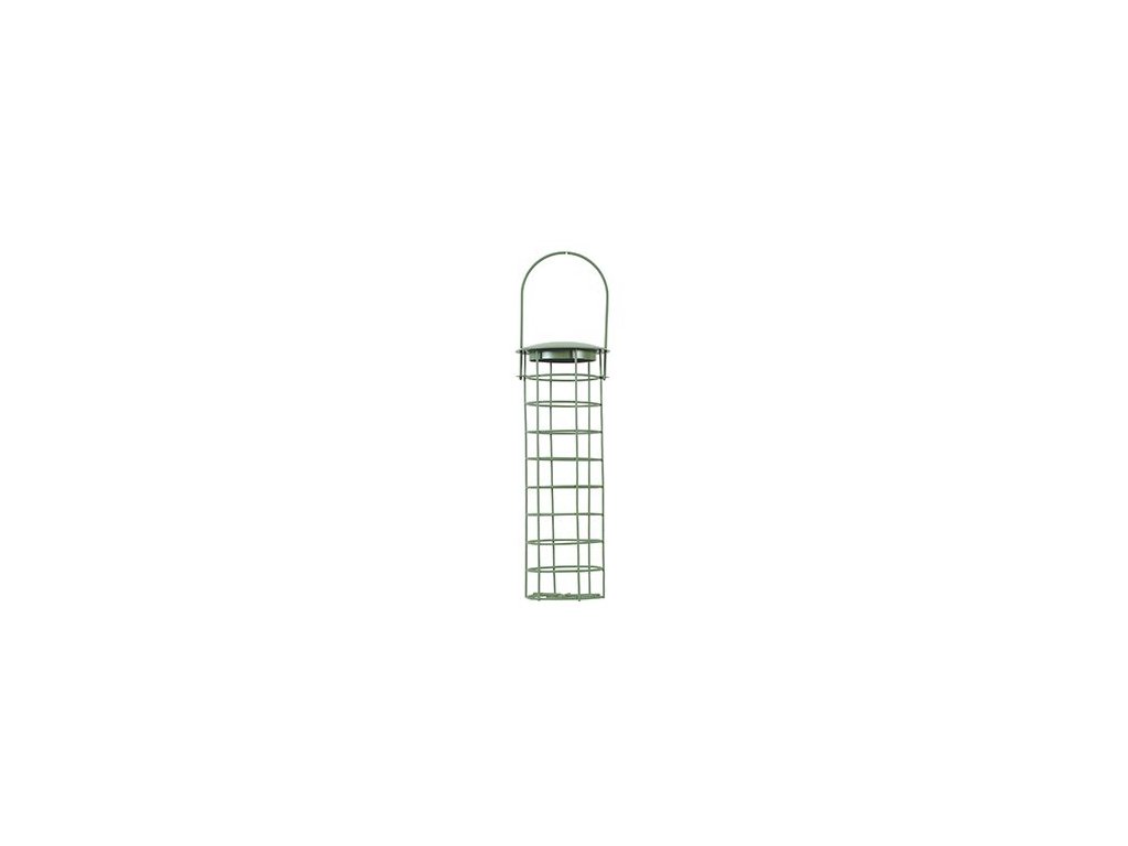 Závěsné kovové krmítko na 4 lojové koule, se stříškou. Dodáváno bez koulí.