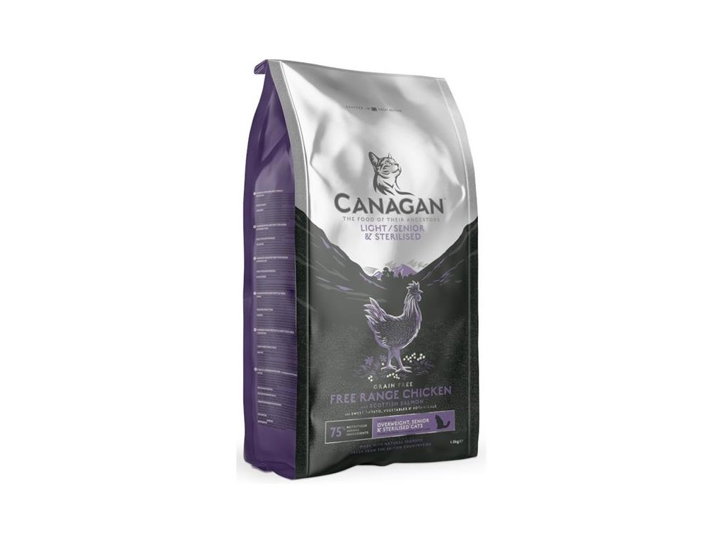 Canagan Cat LIGHT / SENIOR / STERILISED with Chicken & Salmon – receptura bez obilovin, která je připravena speciálně pro kočky s nadváhou nebo se sklony k nadváze, pro starší kočky a/nebo pro kastrované kočky. Čerstvé kuřecí maso z volně chovaných kuřat a čerstvé maso z lososa používá Canagan pouze v kvalitě pro lidskou spotřebu. Živočišné suroviny jsou perfektně doplněny mnoha druhy zeleniny a bylin.