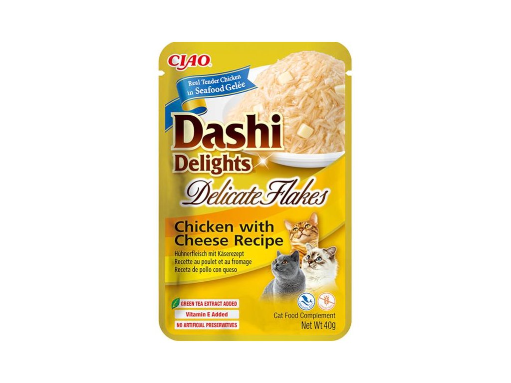 Lahodná kuřecí kapsička obsahuje jemné maso a sýr smíchané s vývarem z hřebenatky a japonským vývarem daši. Daši je tradiční japonský rybí vývar z tuňákových vloček bonito známý svou výjimečně lahodnou chutí. Jeho zařazení do jídelníčku vaší kočky může dodat krmení nový rozměr a učinit z něj skutečný zážitek. Daši navíc poskytuje důležité živiny včetně vitamínů a minerálů a díky nízkému obsahu kalorií a tuku je zdravým doplňkem stravy. Je to produkt na bázi vývaru, obsahuje tedy vysoké množství vody, čímž přispívá k hydrataci organismu a k prevenci potíží močového ústrojí.