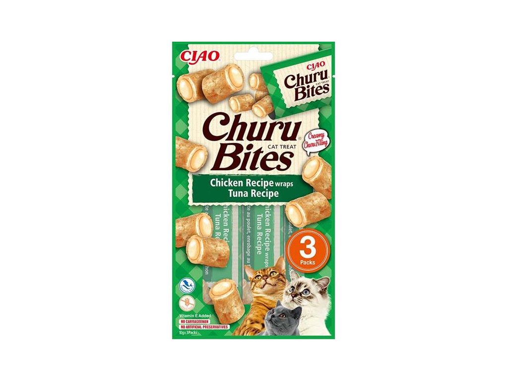 Churu Bites jsou šťavnaté, krémové a extra lahodné pamlsky ve tvaru polštářků s kuřetem z farmářského chovu plněné masovým pyré z divokého tuňáka. Inovativní měkká konzistence pamlsků vám umožní trávit společné chvíle s vaší kočkou hravým a interaktivním způsobem. Pamlsky jsou 100% přírodní, nízkokalorické, bez obilovin (grain-free), bez přidaných konzervantů a umělých barviv. Jsou také ideální pro ukrytí tablety na odčervení či jiného léku, který je potřeba kočce nenásilně podat.