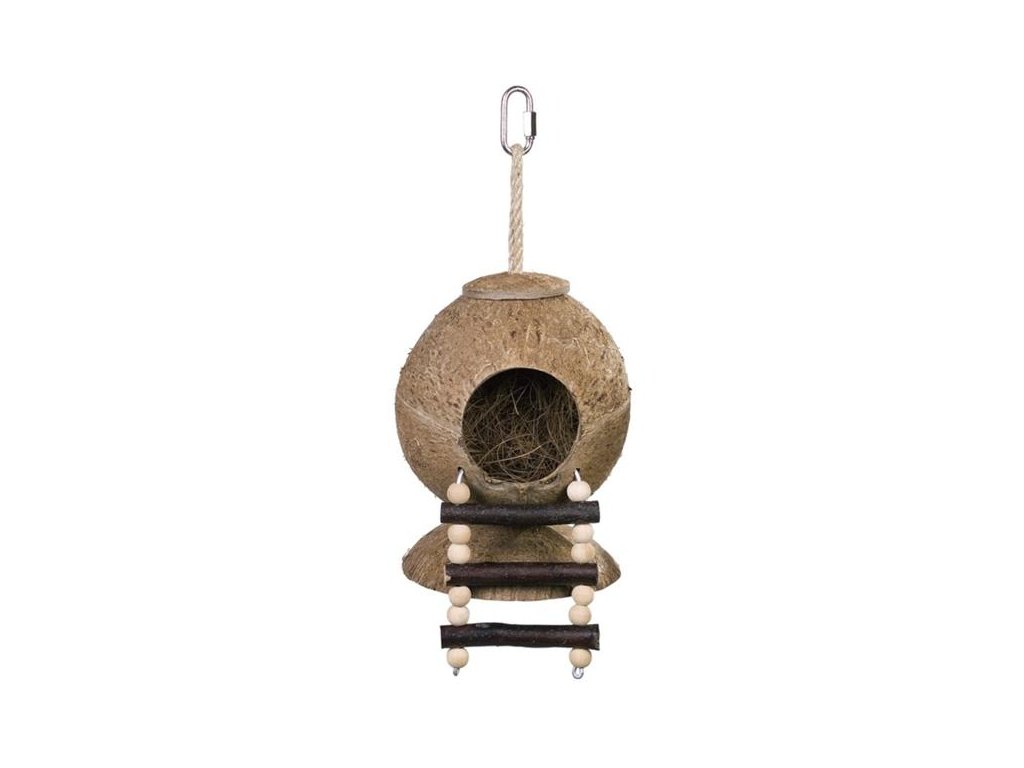 Přírodní domek z kokosového ořechu zavěšený na sisalovém laně a opatřený žebříkem s dřevěnými stupy, poslouží nejen jako úkryt, ale i jako zábavná hračka pro zabavení a obohacení prostředí v kleci. Uvnitř domku jsou vložená kokosová vlákna, která poslouží pro pohodlný odpočinek nebo stavbu hnízda. Domek lze snadno zavěsit v kleci díky karabině.