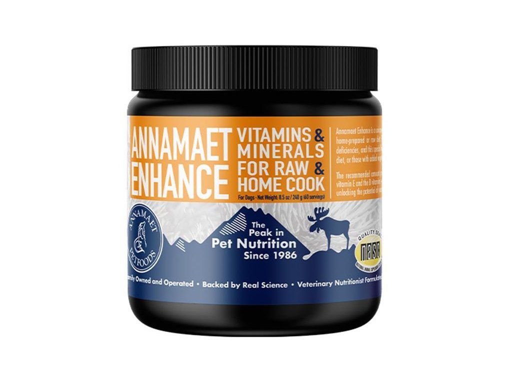 Annamaet Enhance je jedinečně formulovaný vitaminový a minerální doplněk, který je navržený tak, aby jednoduše vyvážil domácí nebo syrovou stravu vašeho psa. Ve složení dvou veterinárních odborníků na výživu certifikovaných společností Enhance poskytuje důležité živiny,tak aby se zabránilo nejčastějším nedostatkům. Tato speciální formulace pomůže splnit současné požadavky na jakoukoli dietu na bázi chudého masa nebo na stravu s přidanou zeleninou, ovocem, oleji nebo obilovinami.VÝHODY:
