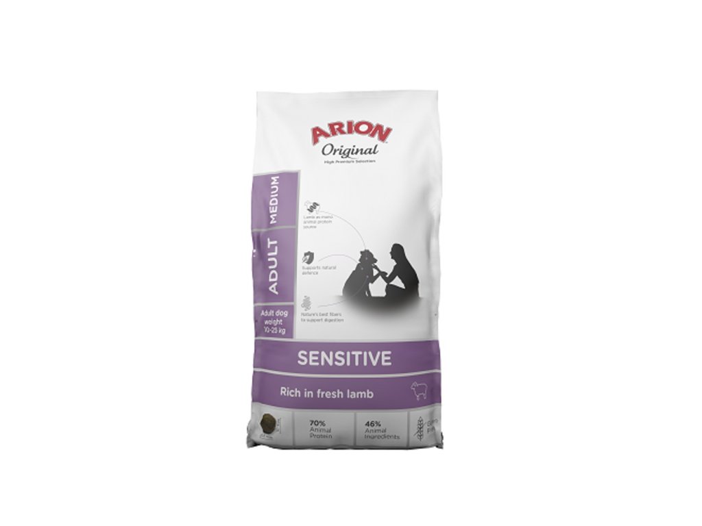 Arion Original Sensitive je kompletní krmivo pro dospělé psy středních plemen. Bezlepková receptura na bázi jehněčího obsahuje různé zdroje vlákniny a prebiotika na podporu zažívání.Složení: Jehněčí 36 % (z toho 14 % čerstvé jehněčí a 22 % sušený jehněčí protein), rýže, kukuřice, hrášek, živočišný tuk, hydrolyzovaná živočišná bílkovina, řepné řízky, rostlinná vláknina, minerální látky, pivovarské kvasnice, psyllium, yucca schidigera, ß-glukany, F.O.S., G.O.S.,M.O.S., sušené bylinky (Rosmarinus sp., Curcuma sp., Eugenia sp.).