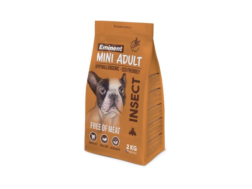 Hypoalergenní kompletní krmivo Eminent Mini Insect je vhodné pro dospělé psy malých a mini plemen, kteří trpí alergiemi na běžně používané zdroje proteinů (hovězí, vepřové apod.). Krmivo neobsahuje maso (pouze drůbeží tuk), aby riziko alergické reakce bylo co nejnižší. Hlavním zdrojem proteinu je hmyz bohatý na kvalitní bílkoviny, vitamíny a minerály. Chov hmyzu je navíc šetrný k životnímu prostředí. Granule jsou obohacené o vejce, mají vyvážený obsah aminokyselin a jsou nutričně hodnotné.