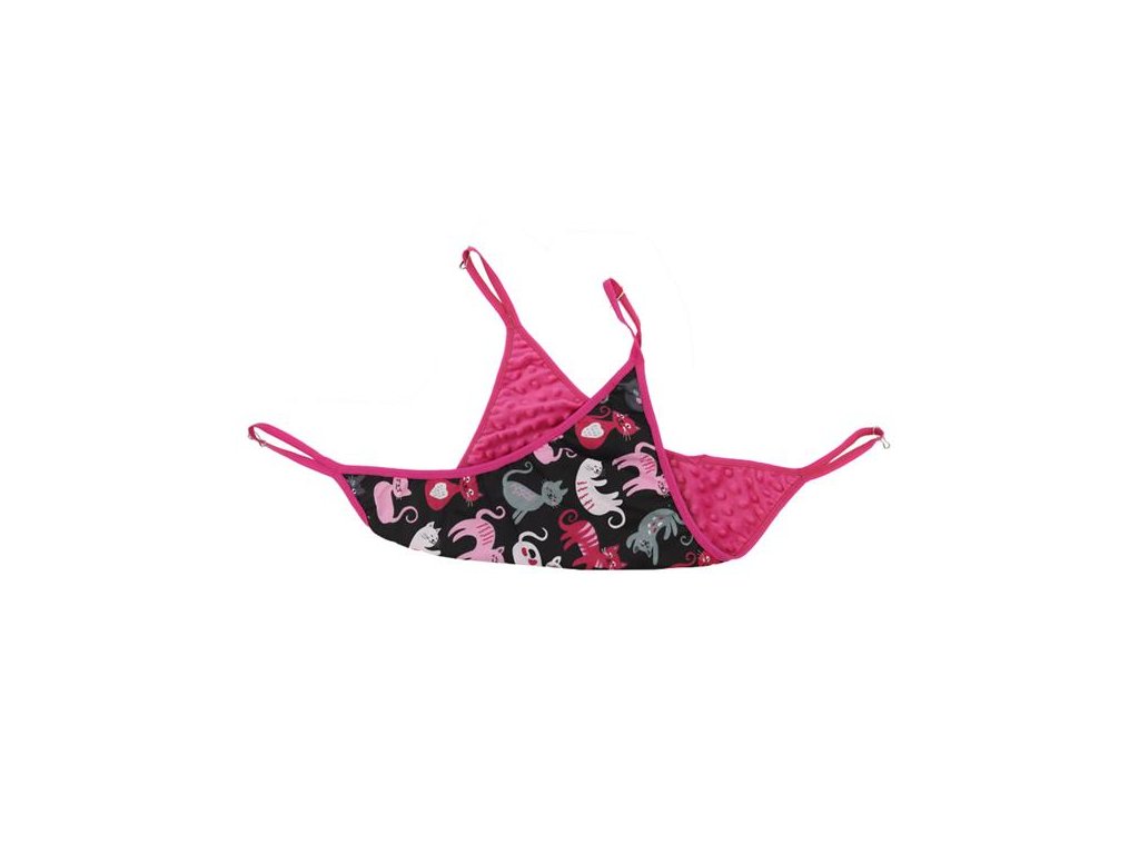 Samohýl Exclusive závěsný pelech (loďka) je pohodlná a odolná hamaka určená k odpočinku i zábavě drobných hlodavců. V rozích má poutka opatřená karabinkami pro snadné připevnění ke kleci. Pružný lem zajišťuje uzavřenější tvar hamaky při zavěšení, takže zvířata mají větší pocit bezpečí. Pelech je ušitý ze dvou vrstev látky: na vnitřní stranu byla použita měkká a hřejivá minky růžové barvy, vnější strana je bavlněná s motivem koček.