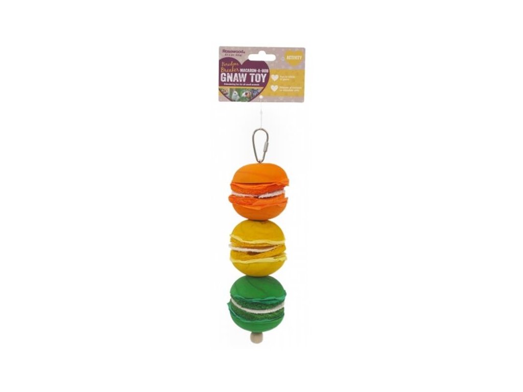Závěsná hračka na hlodání a okusování je vyrobena z lufy a dřeva. Různé textury a barvy pomáhají domácí mazlíčky stimulovat a zabavit. Pro ještě větší zábavu a pestrost lze na kovovou jehlu k „makronkám“ přidat pamlsky nebo zeleninu. Hračka neobsahuje lepidlo a je vyrobena z materiálů a barviv bezpečných pro domácí mazlíčky. Ideální pro králíky, morčata, křečky, činčily, osmáky, pískomily, potkany, myši a další drobné hlodavce.