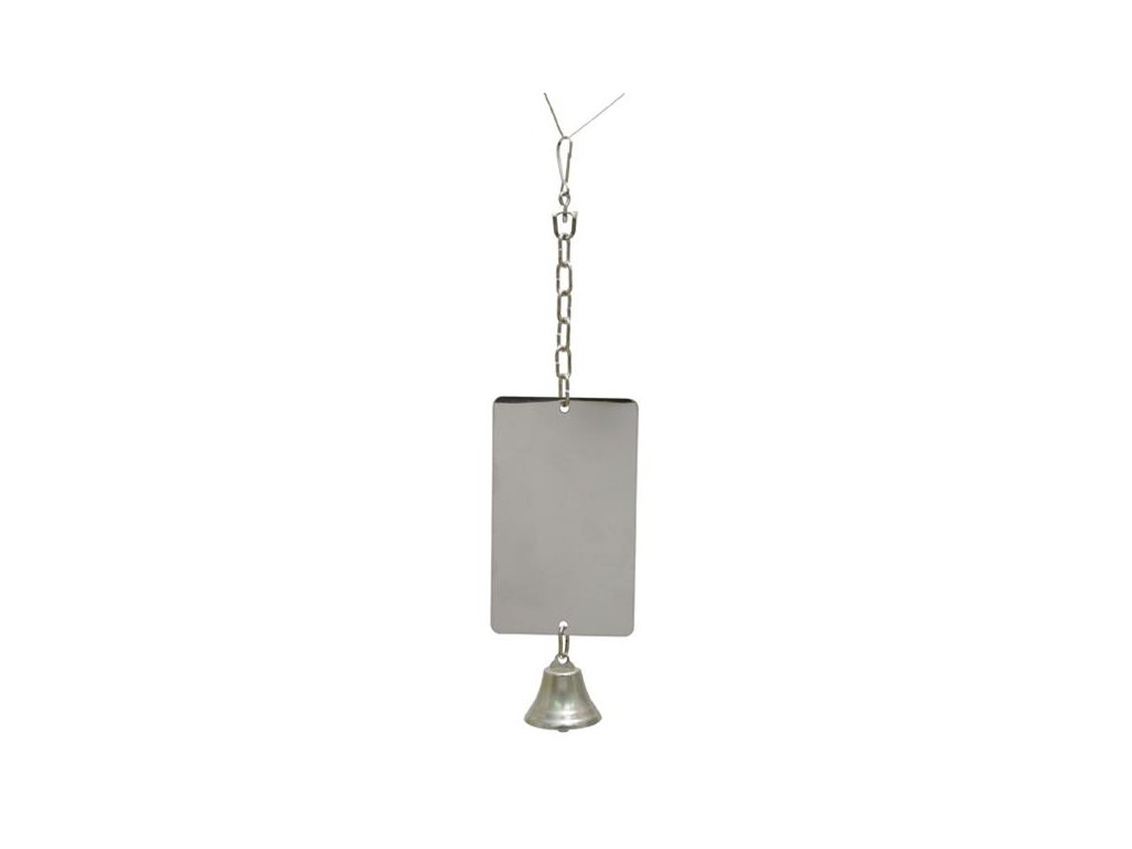 Závěsná kovová hračka pro ptáky – zrcátko se zvonečkem.