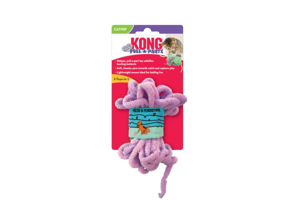 S roztomilou hračkou KONG Pull-A-Partz 3 v 1 zažijí vaše kočky nekonečné množství zábavy a dobrodružství při jejím rozebírání na jednotlivé části a objevování ukrytých hraček. Klubko hebké, ale silné příze je omotané šustivým páskem, po jehož rozepnutí se objeví malá lehká myška. Hračky uspokojí přirozené lovecké instinkty, zaženou nudu a přispějí k udržení dobré fyzické i psychické kondice vašich mazlíčků. Pro větší vzrušení i radost ze hry jsou hračky naplněny magickou šantou kočičí (catnipem), přírodní nenávykovou bylinou, která povzbuzuje ke hře až 70 % koček.