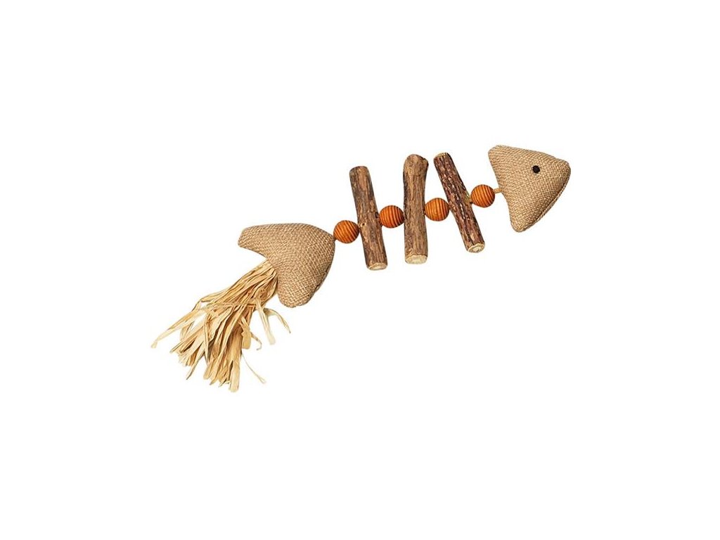 Hračka ve tvaru rybí kosti je složená z matatabi tyčinek, dřevěných kuliček a slámy.