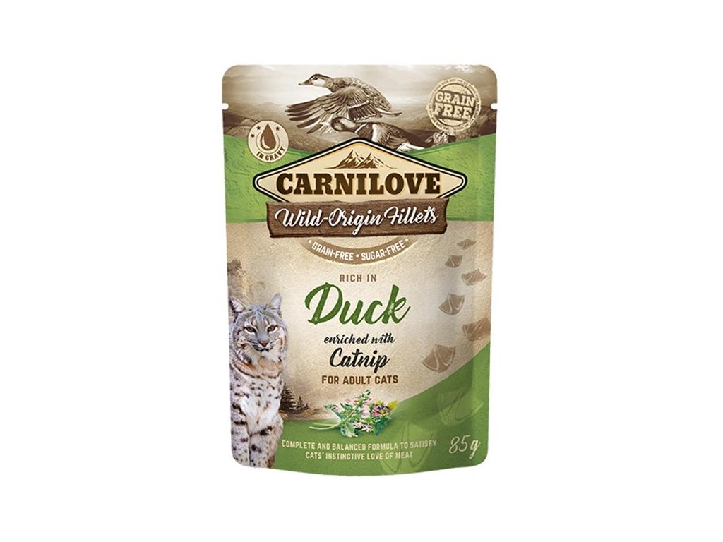 Kapsička pro kočky Carnilove neobsahuje žádné obiloviny a cukr. Receptura Duck je bohatá na kachní maso a je doplněna o šantu kočičí. Kachní filety jsou naloženy ve šťávě. Jedná se o kompletní krmivo pro kočky. Kapsičky pro kočky Carnilove Cat Pouch lze zakoupit v 7 lahodných příchutích.