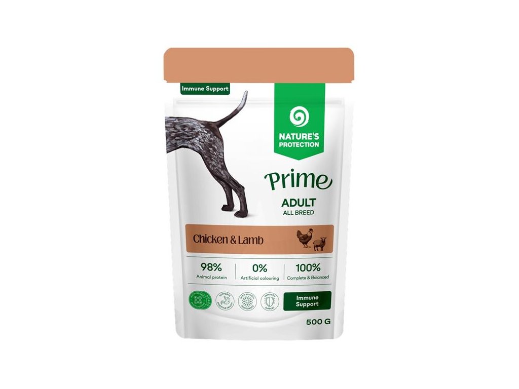Kapsička Nature’s Protection Prime Immunity Support s kuřecím a jehněčím masem poskytuje kompletní a vyváženou každodenní stravou navrženou pro dospělé psy tak, aby podporovala jejich imunitní systém a celkové zdraví. Jemná konzistence, přirozený obsah vlhkosti a pečlivě vybrané živočišné bílkoviny dodávají energii a zajišťují výbornou chutnost.