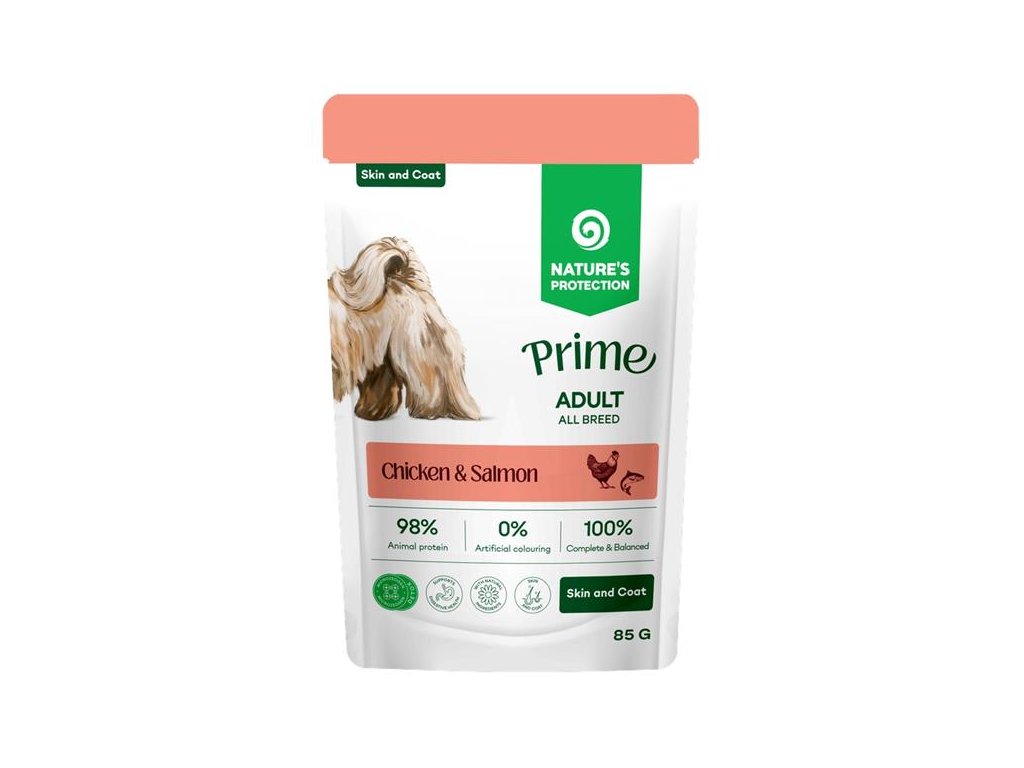 Kapsička Nature’s Protection Prime Skin & Coat s kuřecím masem a lososem poskytuje kompletní a vyváženou každodenní stravou navrženou pro dospělé psy tak, aby podporovala zdraví kůže a lesk srsti. Snadno stravitelné bílkoviny, přirozený obsah vlhkosti a pečlivě vybrané suroviny pomáhají udržovat celkovou kondici a vitalitu psa.