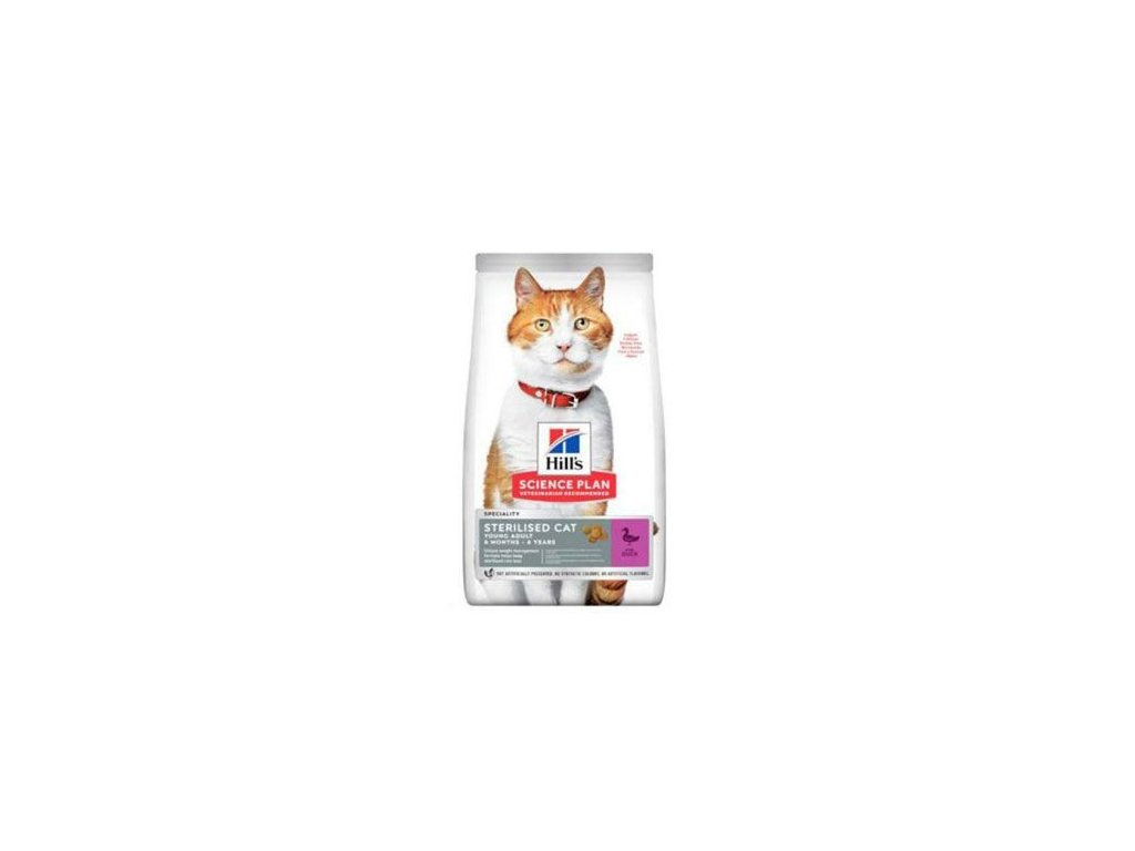 HILL'S SCIENCE PLAN Sterilized Cat suché krmivo pro dospělé kočky s kachnou má unikátní složení pro regulaci hmotnosti a pomáhá tak udržovat štíhlost u kastrovaných koček. Vyrobeno z vysoce kvalitních, snadno stravitelných surovin.