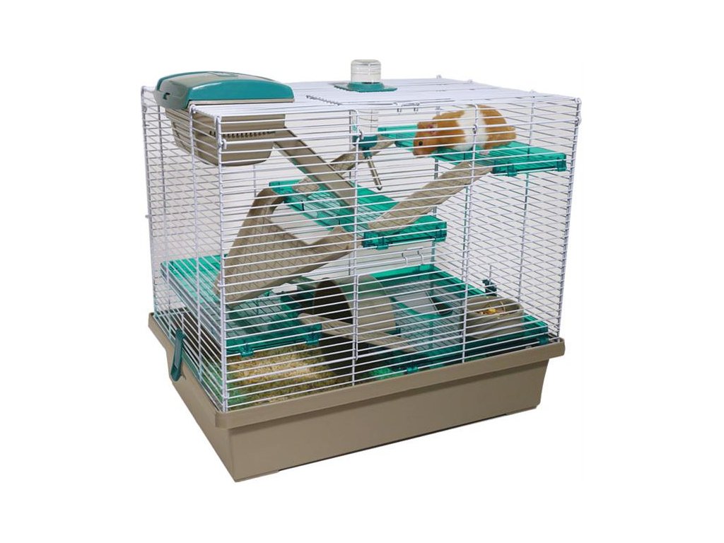 Plně zařízená klec pro syrské křečky a křečíky.