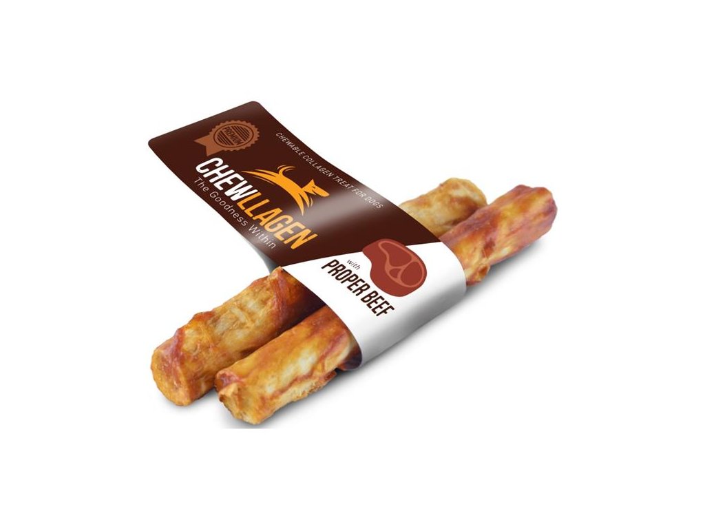 Pochoutky Chewllagen jsou ideální jako odměna, jíž psovi dodáte sílu a podpoříte jeho zotavení např. po delší procházce. Vyrábějí se z čistého kolagenu získávaného z kůže volně pasených jihoamerických krav. V procesu ohřevu jsou kolagenové bílkoviny hydrolyzovány a štěpí se na menší, snadněji stravitelné molekuly. Poté je kolagen vytvarován, upečen a nakonec dochucen skutečným hovězím nebo kuřecím.