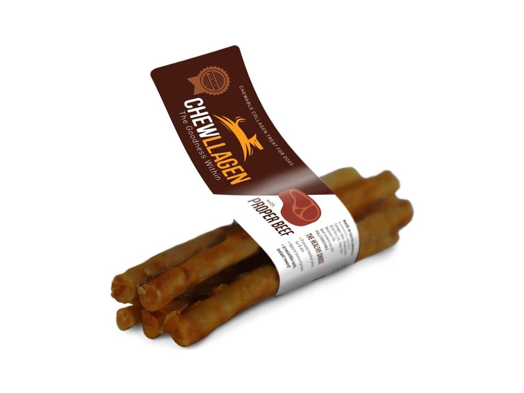 Pochoutky Chewllagen jsou ideální jako odměna, jíž psovi dodáte sílu a podpoříte jeho zotavení např. po delší procházce. Vyrábějí se z čistého kolagenu získávaného z kůže volně pasených jihoamerických krav. V procesu ohřevu jsou kolagenové bílkoviny hydrolyzovány a štěpí se na menší, snadněji stravitelné molekuly. Poté je kolagen vytvarován, upečen a nakonec dochucen skutečným hovězím nebo kuřecím.