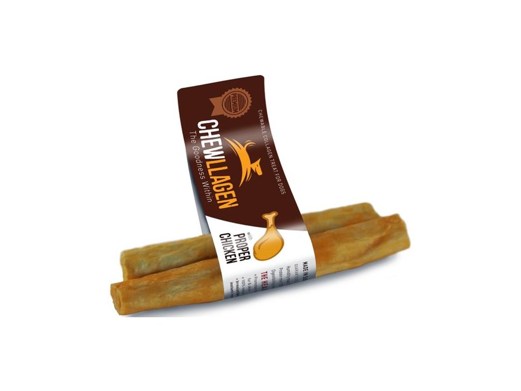 Pochoutky Chewllagen jsou ideální jako odměna, jíž psovi dodáte sílu a podpoříte jeho zotavení např. po delší procházce. Vyrábějí se z čistého kolagenu získávaného z kůže volně pasených jihoamerických krav. V procesu ohřevu jsou kolagenové bílkoviny hydrolyzovány a štěpí se na menší, snadněji stravitelné molekuly. Poté je kolagen vytvarován, upečen a nakonec dochucen skutečným hovězím nebo kuřecím.