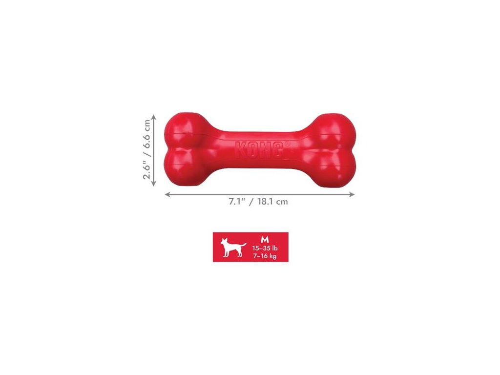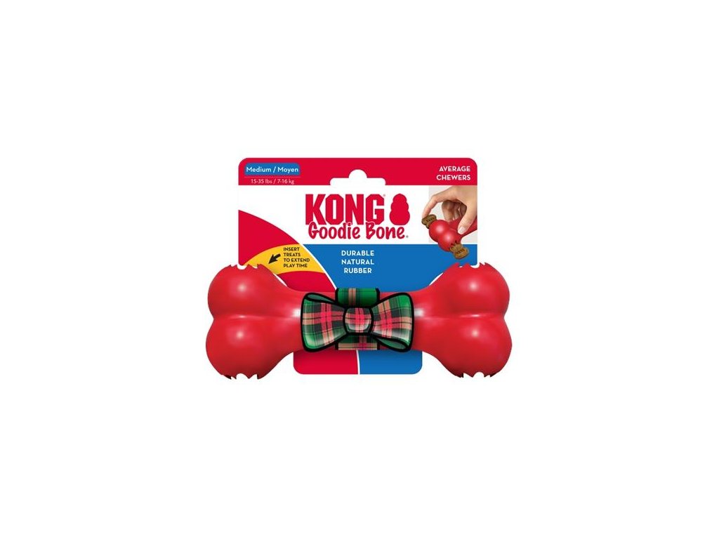 KONG Goodie Bone je ideální hračka pro psy, kteří milují kousání. Je vyrobena z odolné přírodní gumy KONG v typickém červeném provedení a má tvar kosti, který uspokojuje přirozenou psí potřebu kousat. Speciální otvory Goodie Grippers dělají z této kosti interaktivní hračku, kterou lze naplnit granulemi nebo pamlsky – například sušenkami KONG Snacks s trochou pasty KONG Easy Treat.