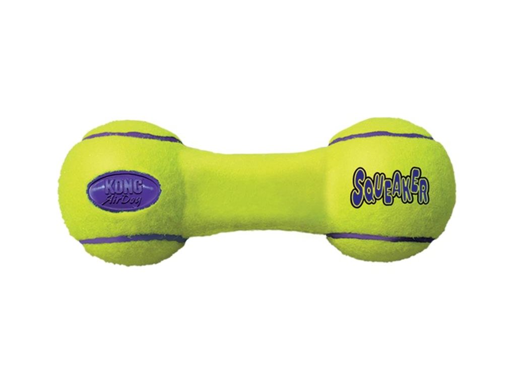 Hračky pro psy originál AIR KONG SQUEAKER od zakladatele anglické psí školy doktora Mugforda se vyrábějí v továrně na tenisové míčky. Kvalitní kaučuková směs spolu s navulkanizovaným plstnatým povrchem propůjčují těmto zajímavým hračkám pro psy zvýšenou životnost. Hračka Air dog činka Kong je odměňovací hračka, pomocník při výcviku poslušnosti psa a ideální pro aportovací trénink na souši i na vodě nebo pro volnou koupací zábavu psů. Uvnitř hraček je kvalitní pískátko, které motivuje psa ke hře. Povrch hračky je ozdoben výšivku SQUEAKER.