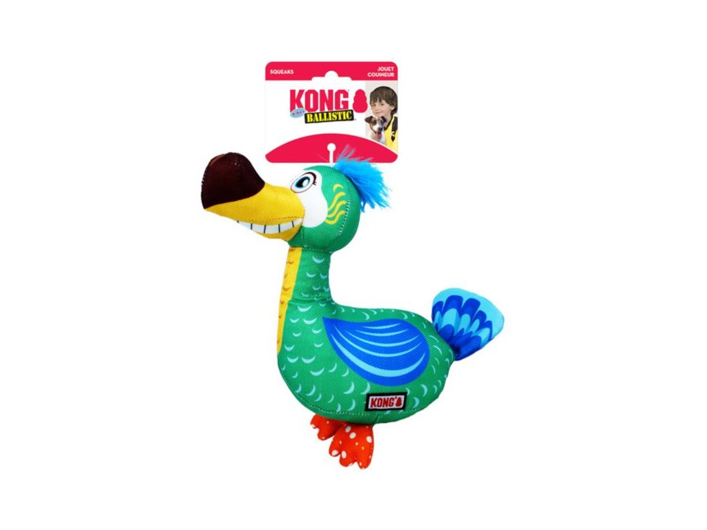 Veselý různobarevný pták Dodo pro psy KONG Ballistic Vibez je vyroben z mimořádně pevného materiálu, který odolá drtivému stisku čelistí i zuřivému lomcování při přetahování. Hračku lze ale s úspěchem využít například při nácviku aportování, zatímco huňatá chocholka, dlouhý zobák a plochý ocásek i nožky svádí spíše k okusování a mazlení. Pták navíc vydává pískavé zvuky, které stupňují zvědavost a vzrušení a podněcují přirozené psí instinkty. Díky dlouhému krku a zobáku lze hračku snadněji přenášet i uchopovat, měkké tělo je příjemné na okusování a šetrné k zubům i dásním. Svými rozměry (velikost M/L) vyhovuje psům středních a velkých plemen.