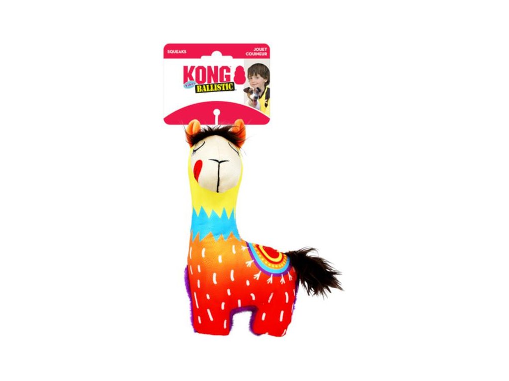 Veselá různobarevná lama pro psy KONG Ballistic Vibez je vyrobena z mimořádně pevného materiálu, který odolá drtivému stisku čelistí i zuřivému lomcování při přetahování. Hračku lze ale s úspěchem využít například při nácviku aportování, zatímco krátká ouška, huňatý ocásek a plyšové břicho svádí spíše k okusování a mazlení. Lama navíc vydává pískavé zvuky, které stupňují zvědavost a vzrušení a podněcují přirozené psí instinkty. Díky dlouhému krku lze hračku snadněji přenášet i uchopovat, měkké tělo je příjemné na okusování a šetrné k zubům i dásním. Svými rozměry (velikost S/M) vyhovuje psům menších a středních plemen.