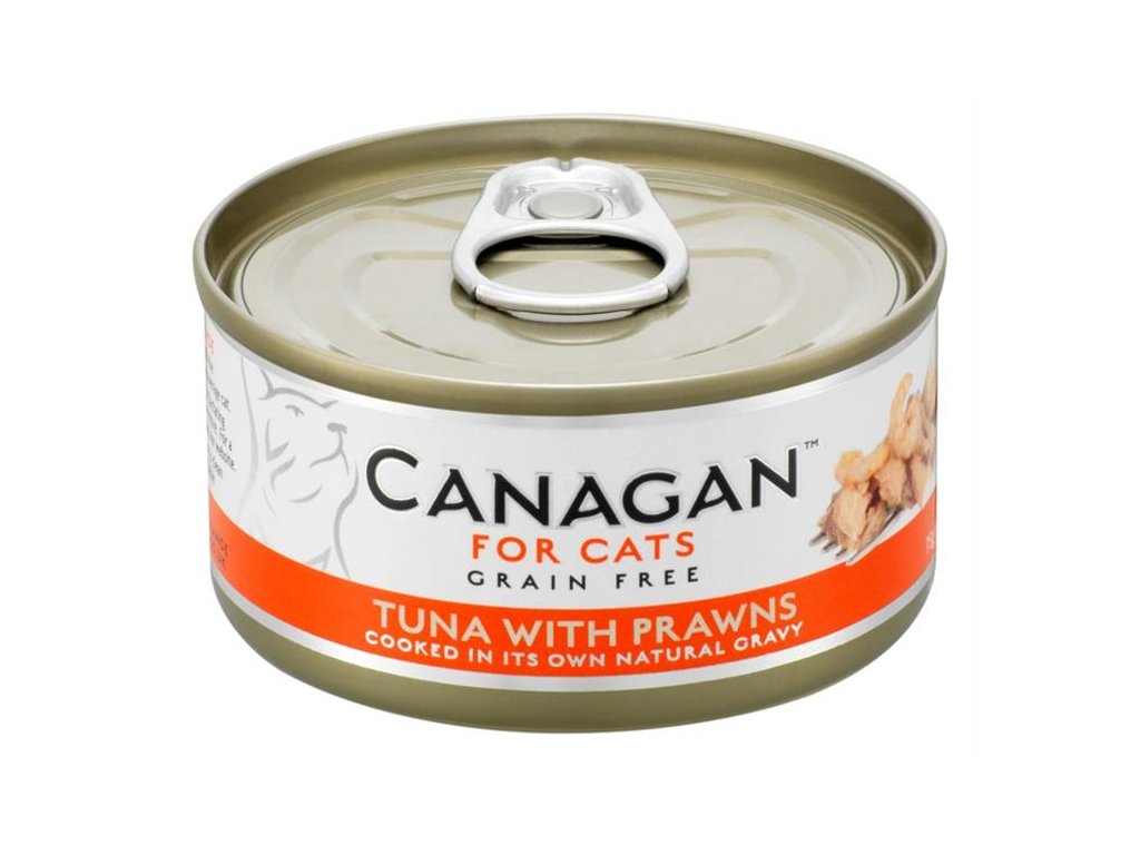Canagan Cat Tuna with Prawns – je kompletní krmivo pro kočky. Vyrobené je z masa z tuňáků, kteří jsou volně lovení metodou šetrného odchytu na udici. Tuňáka doplňují lahodné celé krevetky - vše je šetrně vařené ve vlastní šťávě pro zachování vysoké výživové hodnoty krmiva.