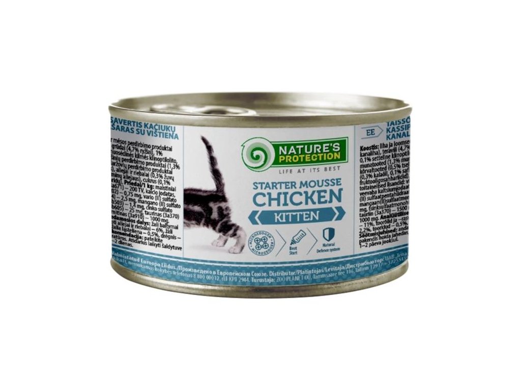 Doplňkové vlhké krmivo ve formě pěny je určené pro koťata po odstavu ve věku 3–12 týdnů a je vhodné i pro březí a kojící kočky. Hlavním zdrojem bílkovin s vysokou nutriční hodnotou je kvalitní kuřecí maso. Vyvážené složení poskytuje kalorie, vitamíny a minerály v množství potřebném pro optimální vývoj koťat. Přidaná aminokyselina taurin podporuje zdraví očí a srdce. Konzerva je ideálním doplňkem k suchému krmivu Nature´s Protection.