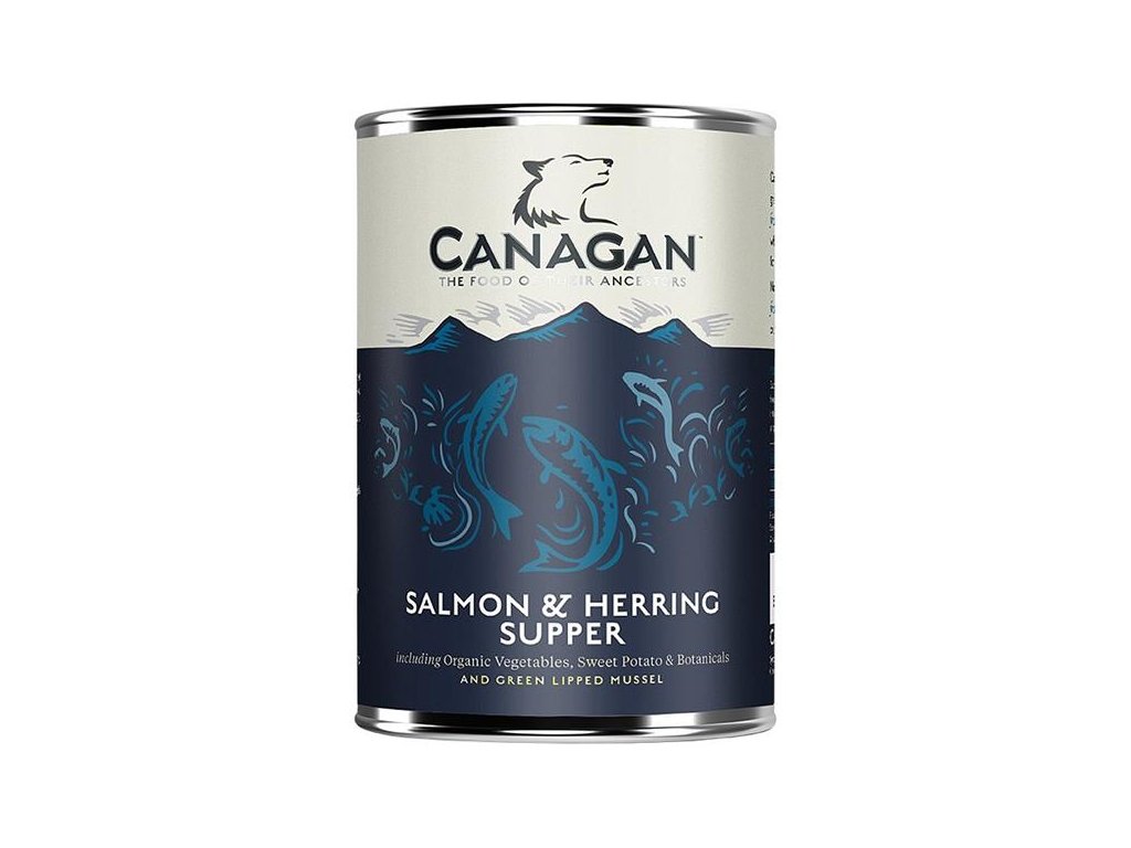 Šťavnatá masová konzerva Canagan Salmon & Herring Supper. Večeře s lososem a sleděm v receptuře bez obilovin - kompletní krmivo pro dospělé psy.
