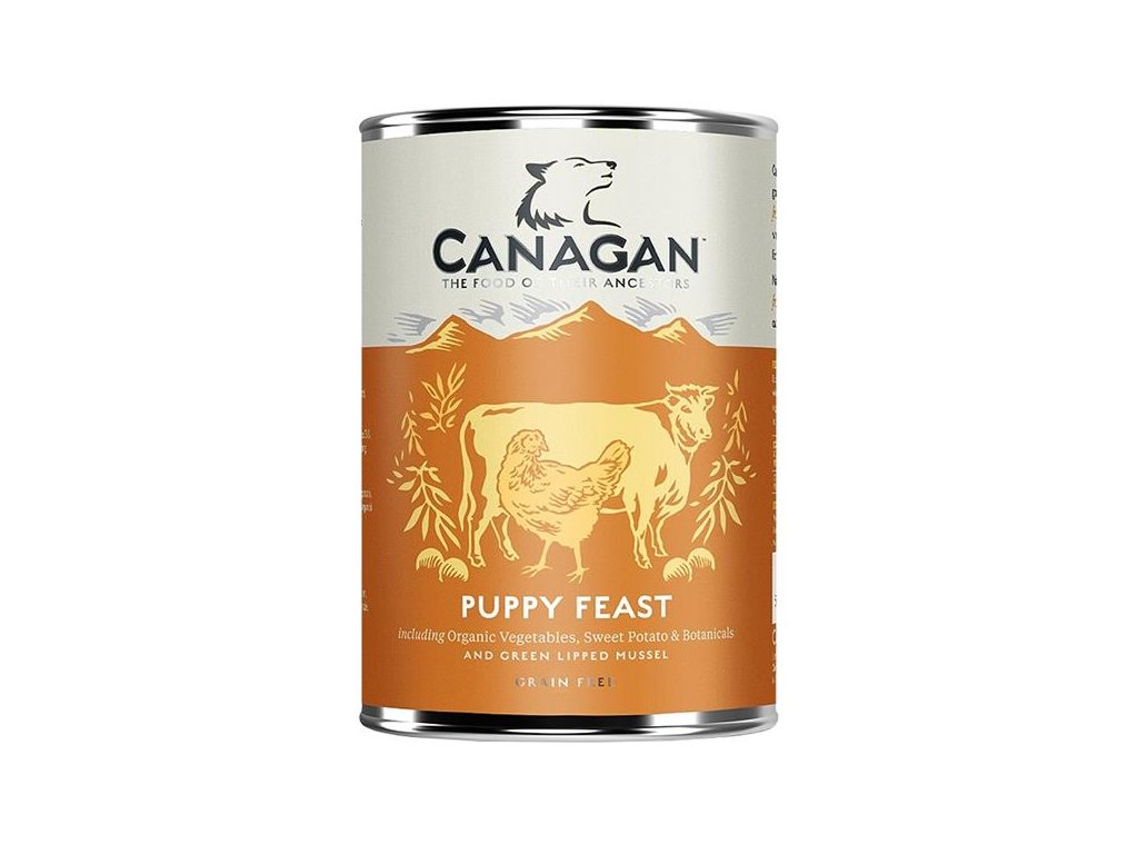 Šťavnatá masová konzerva Canagan Puppy Feast. Hostina pro štěňata v receptuře bez obilovin - kompletní krmivo pro štěňata.