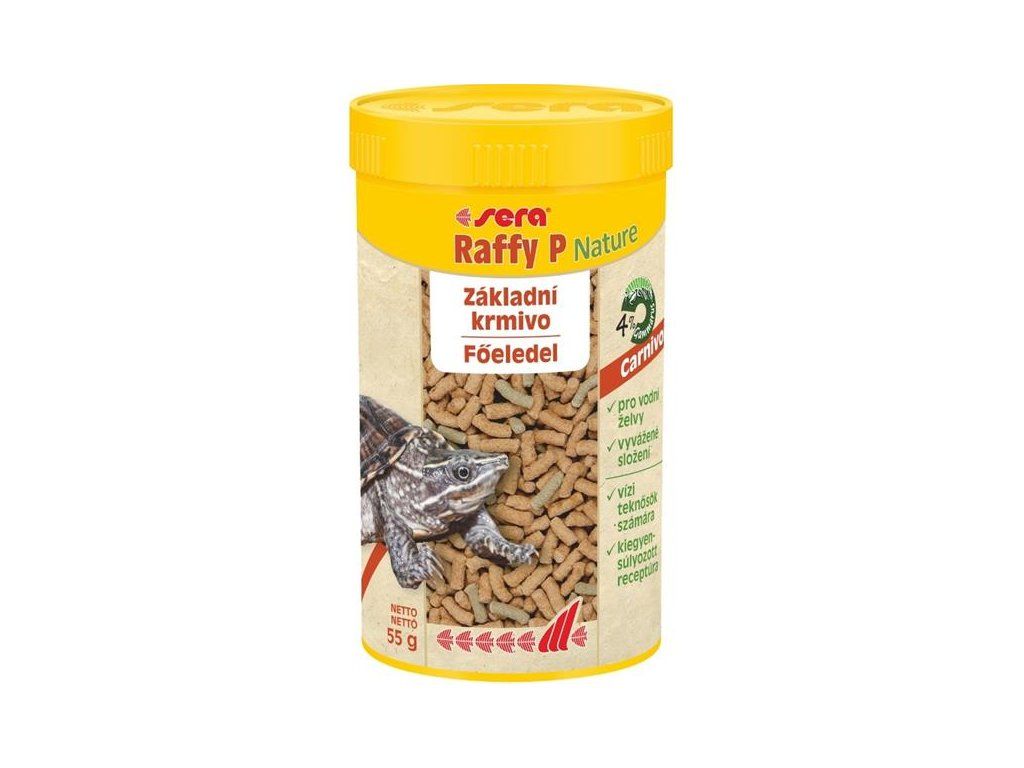 Sera Raffy P Nature jsou chutné plovoucí krmné tyčinky pro denní krmení vodních želv obsahují směs vodních a rostlinných složek. Proto jsou ideální i pro starší vodní želvy, které dávají ve své výživě přednost rostlinným složkám.