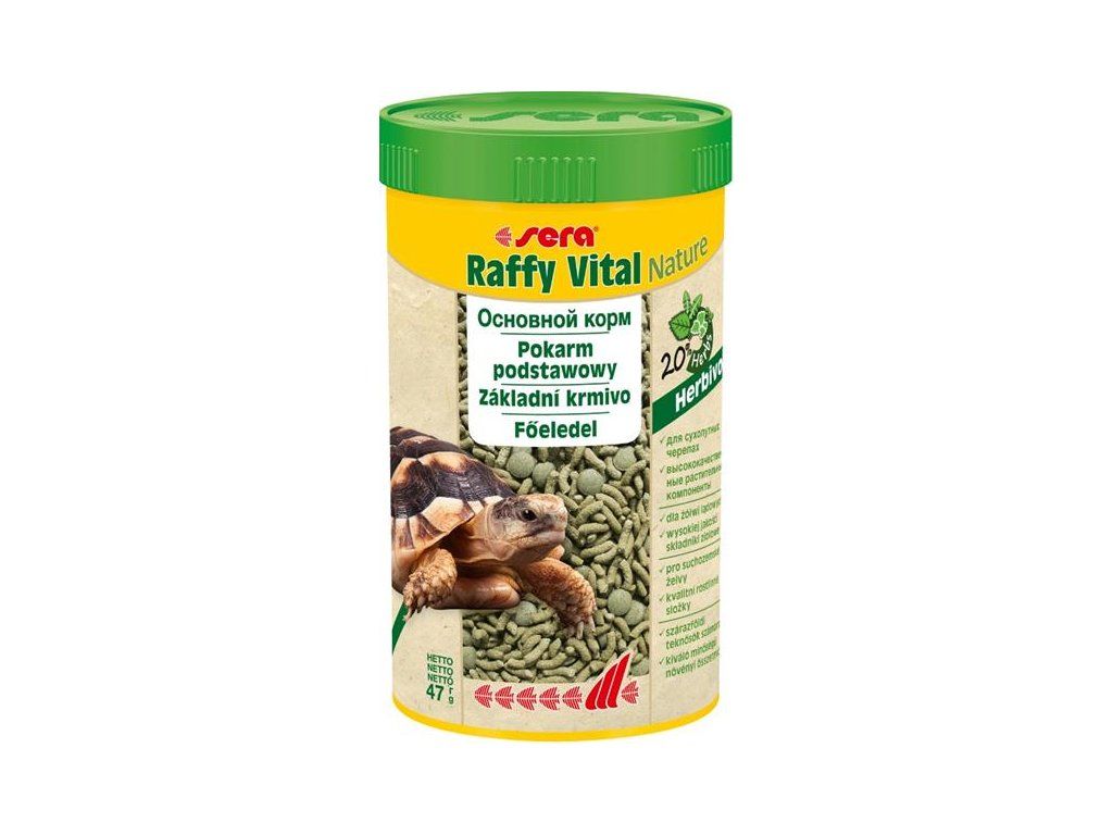 Sera Raffy Vital Nature je základní krmivo bez barviv a konzervačních látek. Obsahuje šetrně vyráběné tyčinky a bylinné tablety pro suchozemské želvy a všechny ostatní býložravé plazy.