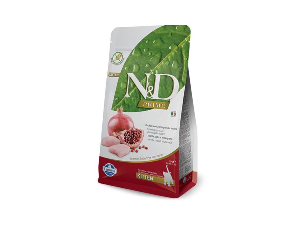 Kompletní suché krmivo bez obilovin, s kuřetem a granátovým jablkem pro koťata a březí nebo kojící kočky. Krmiva pro kočky N&D jsou velmi kvalitní stravou, která byla vyvinuta vědeckým týmem v Neapoli. Granule jsou vyrobeny za čerstva z přírodních ingrediencí, které uspokojí i ty nejmlsnější kočičí jazýčky. Granule N&D Prime Kitten jsou určeny k pokrytí veškerých výživových potřeb kotěte a mladé kočky (potažmo i březí nebo kojící kočce). Granule s označením PRIME obsahují vysoce kvalitní suroviny živočišného původu (70 %). Naopak neobsahují obilniny a geneticky modifikované organismy. Italská receptura je založena na poměru 70:30:0 (70 % ingrediencí živočišného původu, 30 % ovoce + zelenina + minerály, 0 % obilnin).