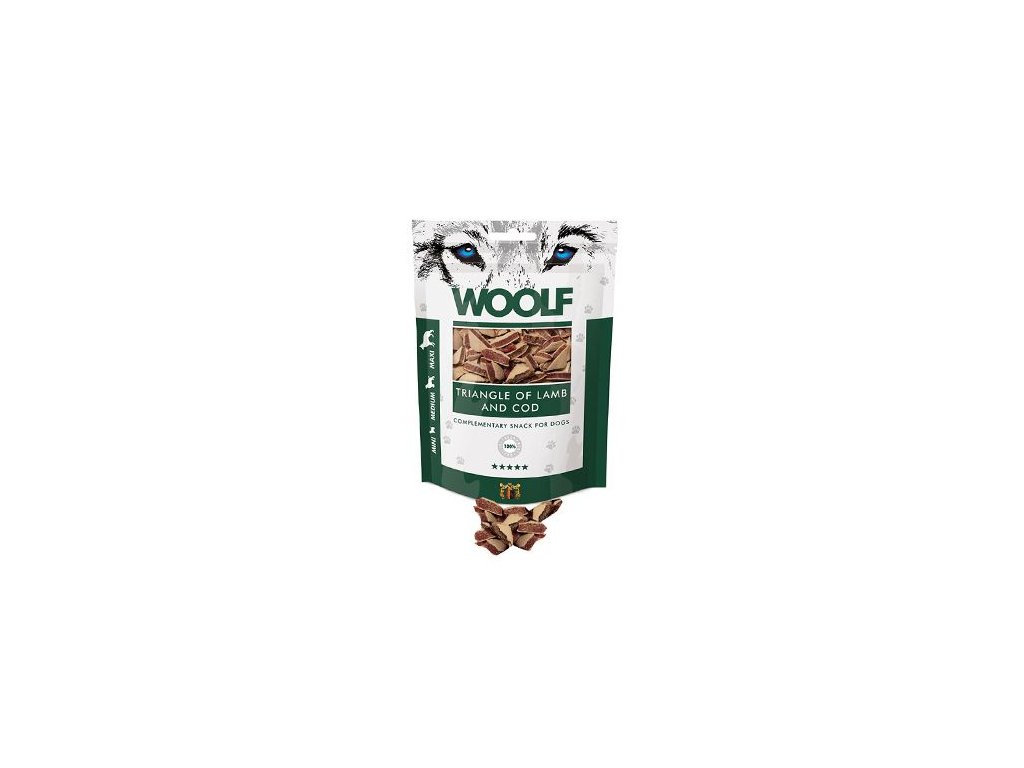 Měkký masový pamlsek z jehněčího masa s treskou ve tvaru trojúhelníčku je vhodný pro malá a střední plemena psů. Pamlsek díky svému tvaru podněcuje psy ke žvýkání. Balení obsahuje velké množství pochoutek, které již nemusíte pro psa lámat, aby bylo možné podat odměnu vícekrát. Pamlsek je měkký a vhodný jak pro dospělé psy tak i štěňata a starší psy. Díky obsahu jehněčího masa a tresky vhodný i pro citlivé a alergické psy. Pochoutka je vhodná i pro kočky. Pochoutky Woolfsnacks jsou speciálně navrženy pro psy všech plemen. Při výrobě jsou ze 100% použity bílkoviny té nejvyšší kvality pro co nejlepší příjem potravy. Veškeré pochoutky Woolfsnacks, jakmile se vyrobí, jsou zabaleny bez chemických přísad, konzervačních látek, nebo barviv. K zajištění ochrany je do sáčku umístěn absorbér kyslíku. Nekonzumovat okysličovadlo.