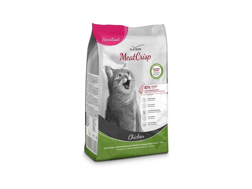 Kompletní bezlepkové krmivo Platinum MeatCrisp pro kastrované kočky obsahuje 83 % čerstvého kuřecího masa připravovaného unikátní metodou Freshmeatdryer, při níž se do sušičky, kde při nízké teplotě cirkuluje vzduch, vloží čerstvé maso s dalšími přísadami. Pomalé a rovnoměrné sušení zachovává přirozenou chuť masa i důležité živiny. Proto jsou granule MeatCrisp zdravé, křupavé, plné chuti a neodolá jim ani ten nejmlsnější kočičí jazýček.