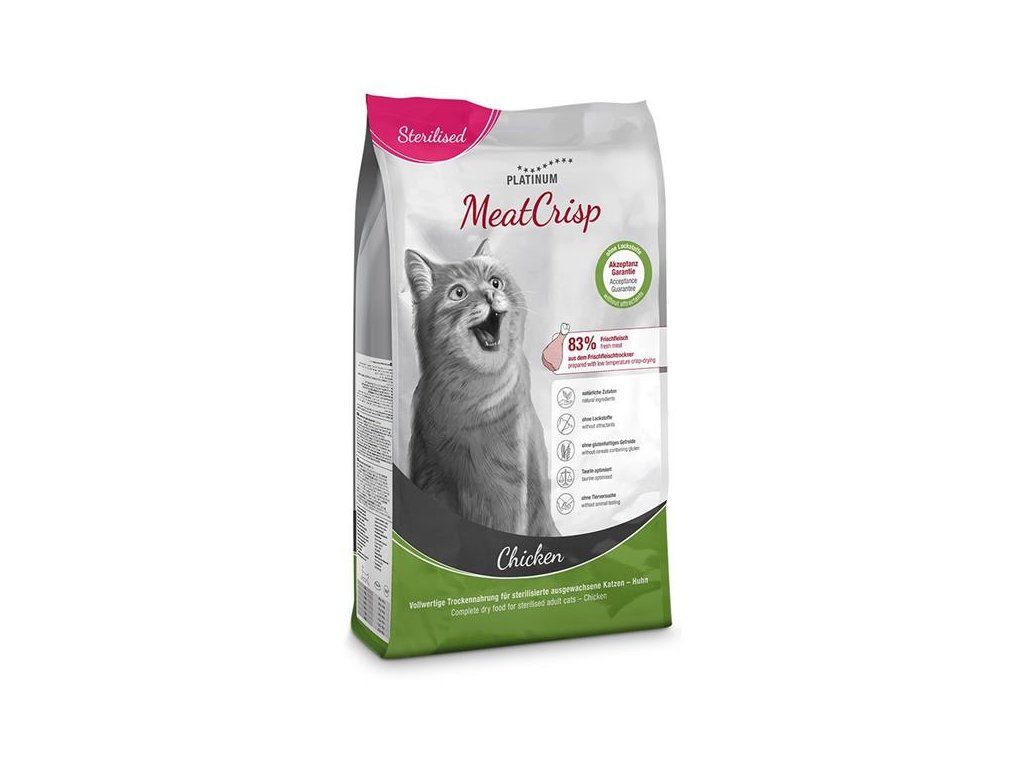 Kompletní bezlepkové krmivo Platinum MeatCrisp pro kastrované kočky obsahuje 83 % čerstvého kuřecího masa připravovaného unikátní metodou Freshmeatdryer, při níž se do sušičky, kde při nízké teplotě cirkuluje vzduch, vloží čerstvé maso s dalšími přísadami. Pomalé a rovnoměrné sušení zachovává přirozenou chuť masa i důležité živiny. Proto jsou granule MeatCrisp zdravé, křupavé, plné chuti a neodolá jim ani ten nejmlsnější kočičí jazýček.