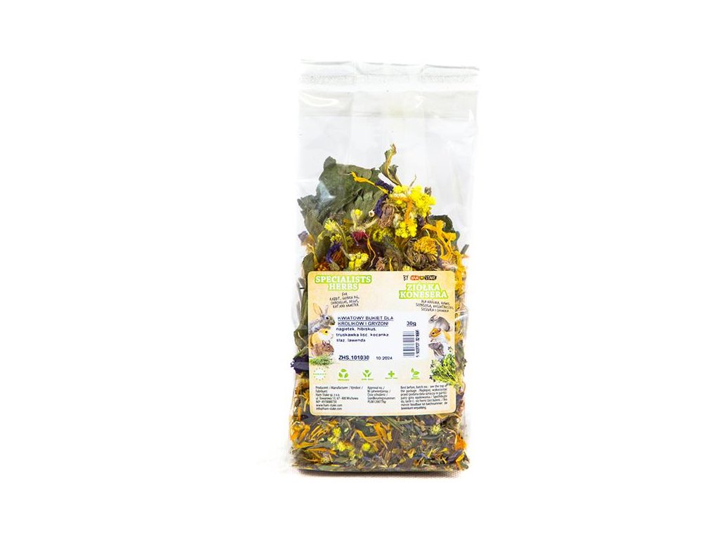 Čistě přírodní směs květů a bylin je určená ke zpestření jídelníčku vašeho drobného hlodavého kamaráda. Chutné sušené květy můžete zvířeti opatrně nabízet z ruky jako odměnu a tím upevňovat váš vztah. Nebo můžete několik kousků schovat v kleci či v ohrádce a podnítit tak u zvířete přirozený pud hledání potravy.