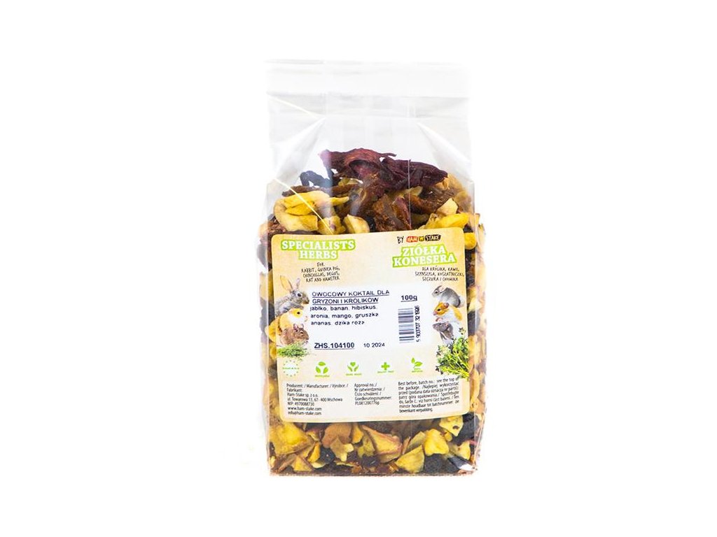 Čistě přírodní směs ovoce a květů je určená ke zpestření jídelníčku vašeho drobného hlodavého kamaráda. Chutné sušené ovoce (jablko, banán, mango, hruška a ananas) doplněné o ibišek, arónii a divokou růži můžete zvířeti opatrně nabízet z ruky jako odměnu a tím upevňovat váš vztah. Nebo můžete 1–2 kousky schovat v kleci či v ohrádce a podnítit tak u zvířete přirozený pud hledání potravy.