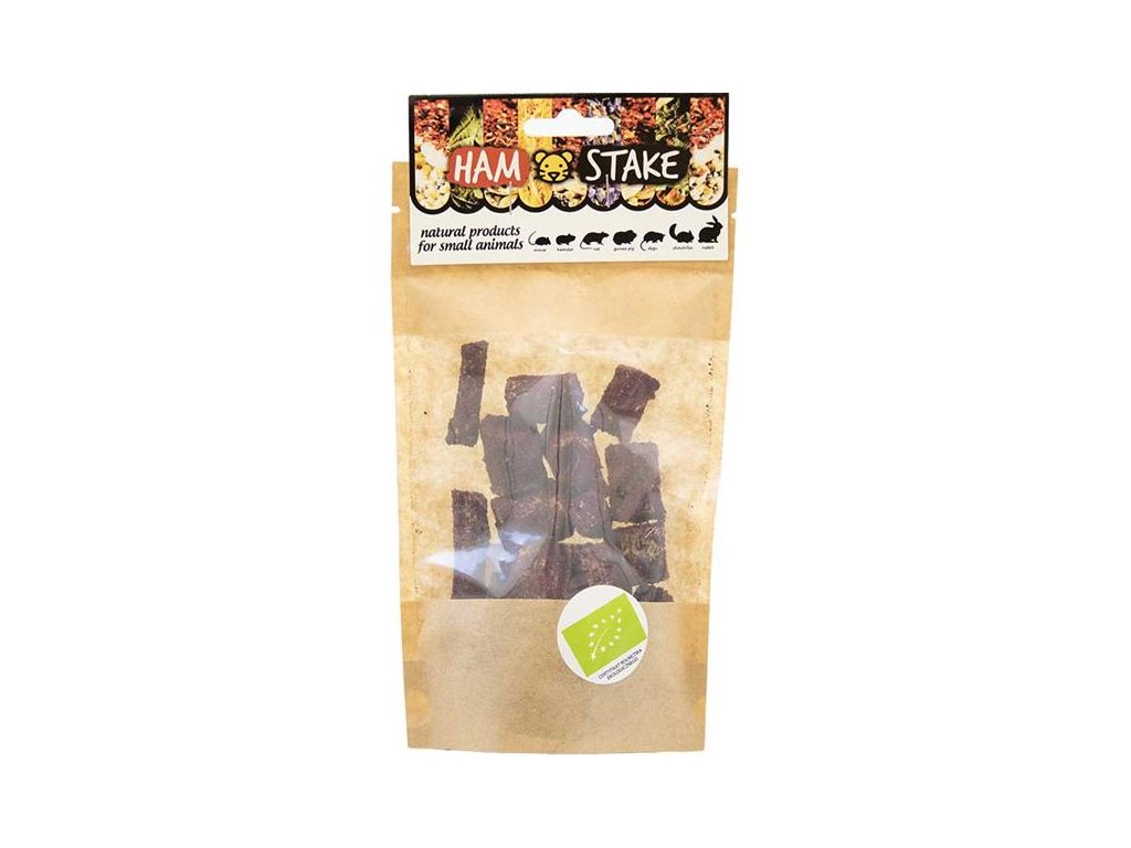 Grain free pamlsky Ham-Stake s kousky topinamburových stonků obalených v sušené červené řepě jsou ideální chutnou, křupavou a zdravou svačinkou pro králíky, morčata, osmáky, činčily, křečky, potkany, myši a pískomily. Topinamburové stonky a červená řepa jsou vhodným zdrojem dietní vlákniny a obsahují množství přirozeně se vyskytujících vitamínů, minerálů a dalších zdraví prospěšných látek. Upravují zažívání, čistí organizmus, zlepšují krevní oběh, posilují imunitu a zvyšují vitalitu.
