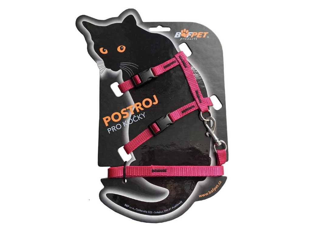 Set postroje a vodítka pro kočky, vyrobený z měkkého popruhu. Spoje jsou šité, pro možnost nastavení je postroj opatřeny plastovou vsuvkou a přezkou. Pro připnutí vodítka jsou vybaveny dvěma déčky.