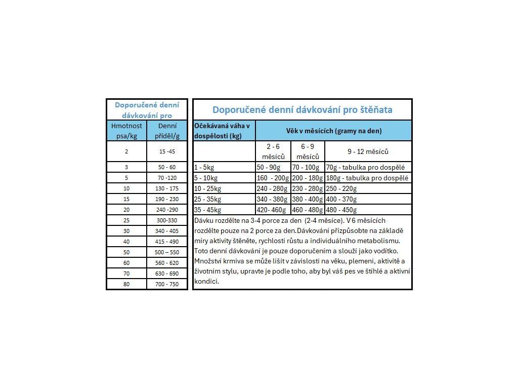 Denní dávkování je pouze doporučením a slouží jako vodítko. Množství krmiva se může lišit v závislosti na věku, plemeni, aktivitě a životním stylu, upravte je podle toho, aby byl váš pes ve štíhlé a aktivní kondici.